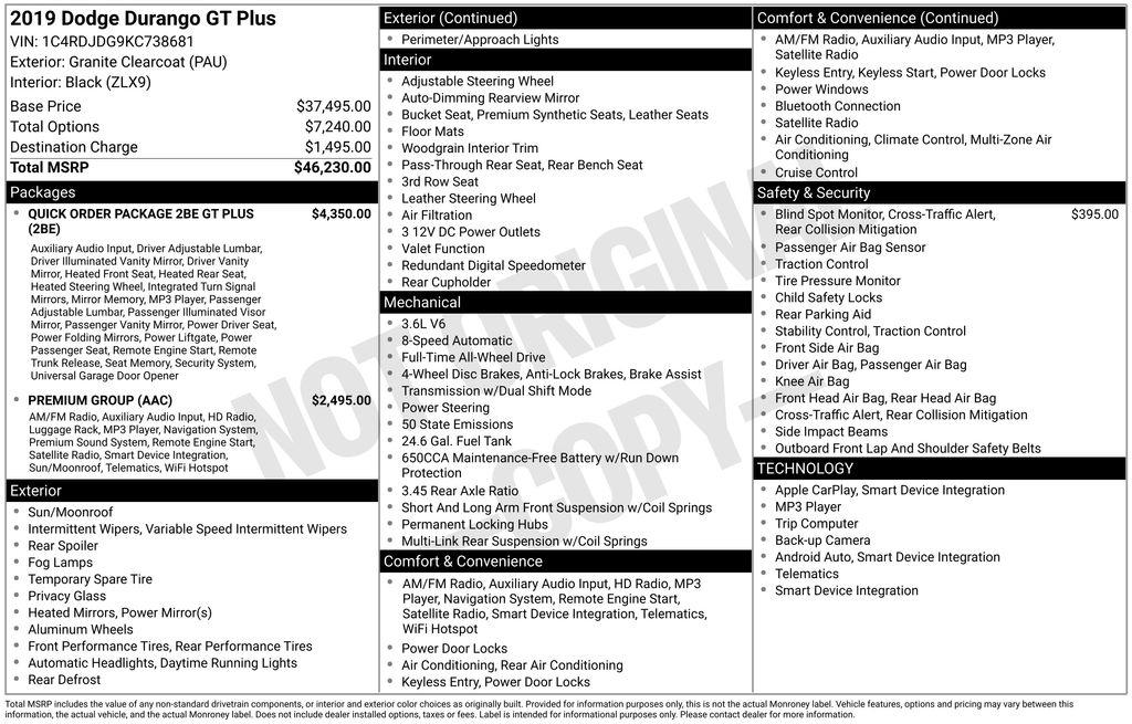 2019 Dodge Durango GT Plus Granite Metallic Clearcoat 3.6L V6 24V VVT 8-Speed Automatic AWD