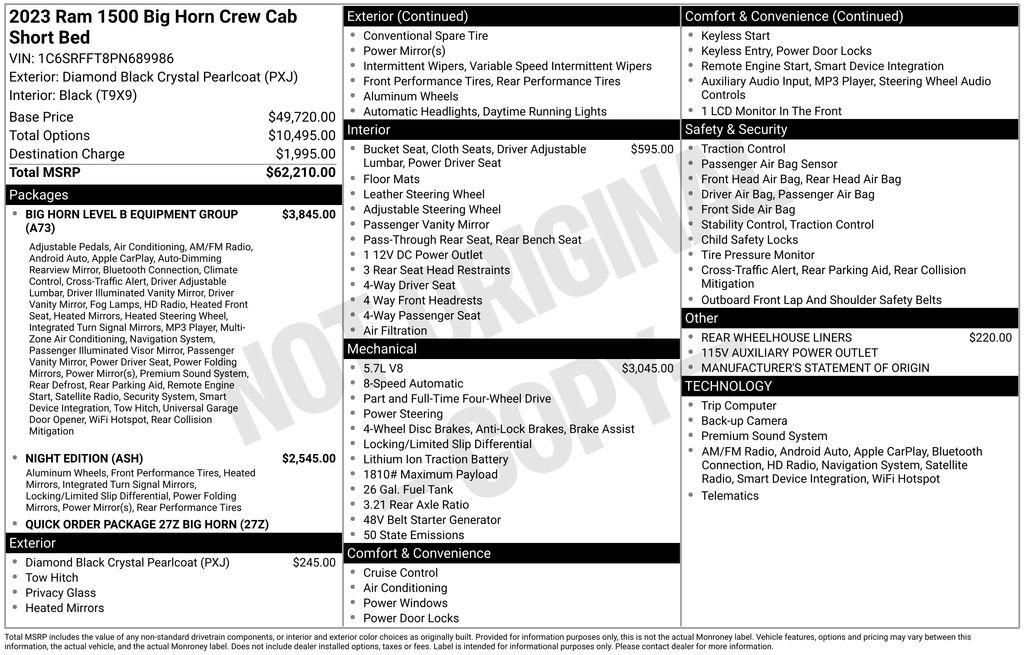 2023 Ram 1500 Big Horn/Lone Star Diamond Black Crystal Pearlcoat HEMI 5.7L V8 Multi Displacement VVT eTorque 8-Speed Automatic 4WD