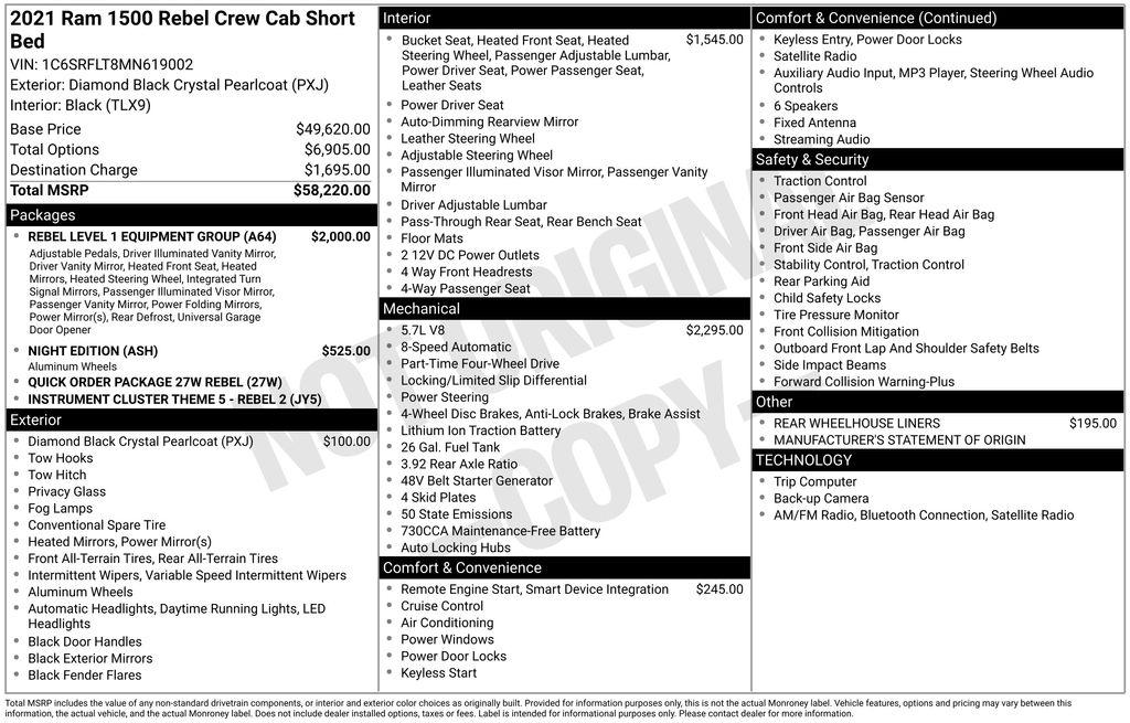 2021 Ram 1500 Rebel Diamond Black Crystal Pearlcoat HEMI 5.7L V8 Multi Displacement VVT 8-Speed Automatic 4WD
