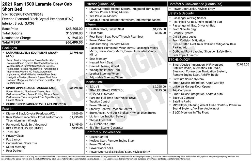 2021 Ram 1500 Laramie Diamond Black Crystal Pearlcoat HEMI 5.7L V8 Multi Displacement VVT 8-Speed Automatic 4WD