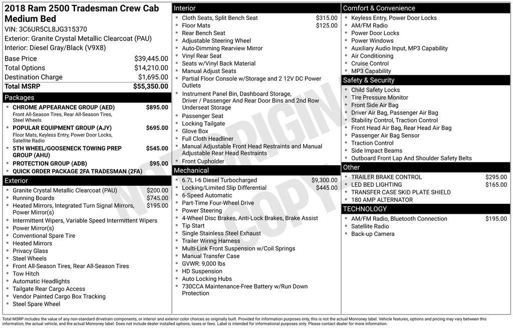 Air Conditioning, Bright Front Bumper, Bright Grille, Bright Rear Bumper, Carpet Floor Covering, Chrome Appearance Group, Delay-off headlights, Front & Rear Floor Mats, Fully automatic headlights, ParkView Rear Back-Up Camera, Popular Equipment Group, Protection Group, Quick Order Package 2FA Tradesman, Rear Folding Seat, Remote Keyless Entry, SiriusXM Satellite Radio, Wheels: 18" x 8.0" Steel Chrome Clad.