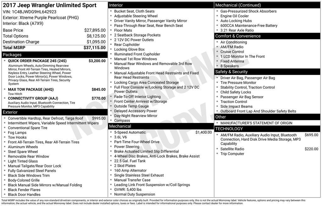 2017 Jeep Wrangler Unlimited Sport Xtreme Purple Pearlcoat 3.6L V6 24V VVT 5-Speed Automatic 4WD