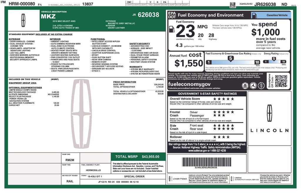 2018 Lincoln MKZ Select Magnetic Gray Metallic 2.0L I4 6-Speed Automatic with Select-Shift AWD